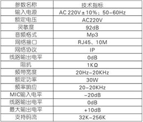 以太网接入;1路网络信号输入,一路麦克风输入,1路音频信号输出;具有点播、选播、优先广播功能,全中文LCD显示屏,按键操作,带USB接口,通过麦克风接口可以实现全双向对讲,自动清除回音,支持24V强切输出,支持模拟/IP双模工作,自带2*20W定阻功率接口,内置喇叭;壁挂式安装。